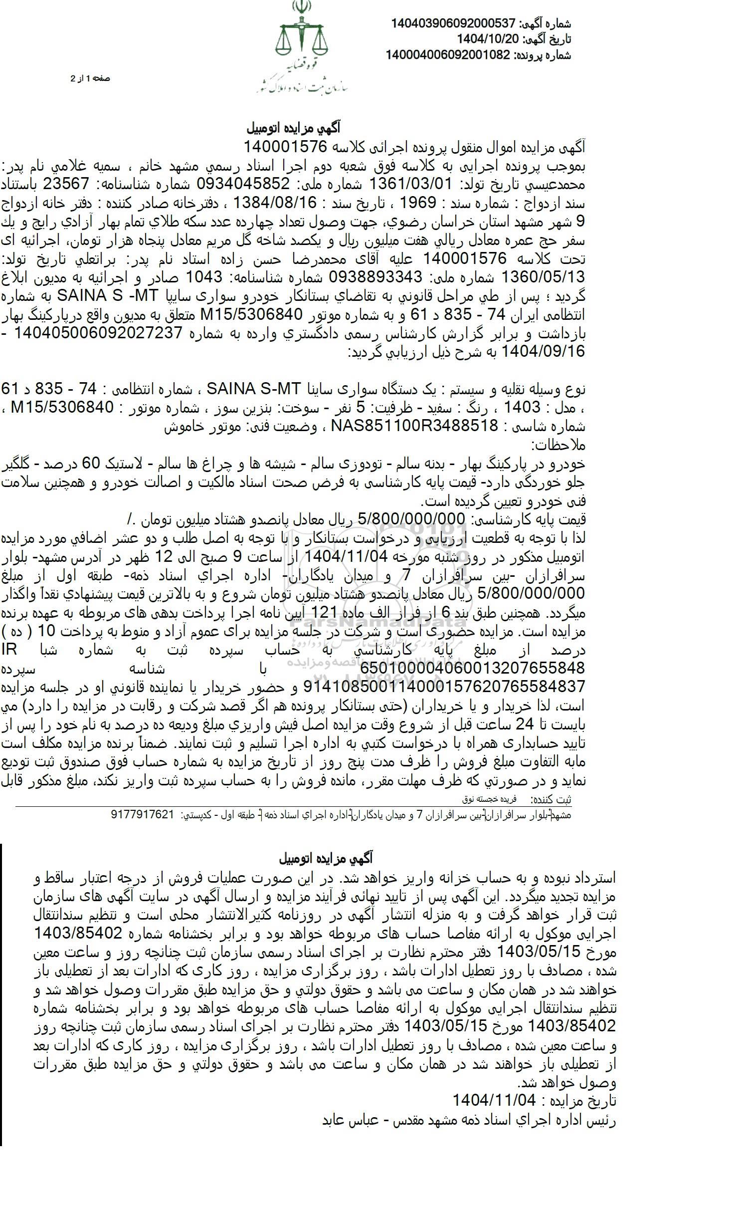 زمان مزایده روز شنبه مورخ 1404.11.04 از ساعت 9 الی 12 ظهر در آدرس مشهد -بلوار سرافرازان - بین سرافرازان 7 و میدان یادگاران - اداره اجرای اسناد ذمه طبقه اول