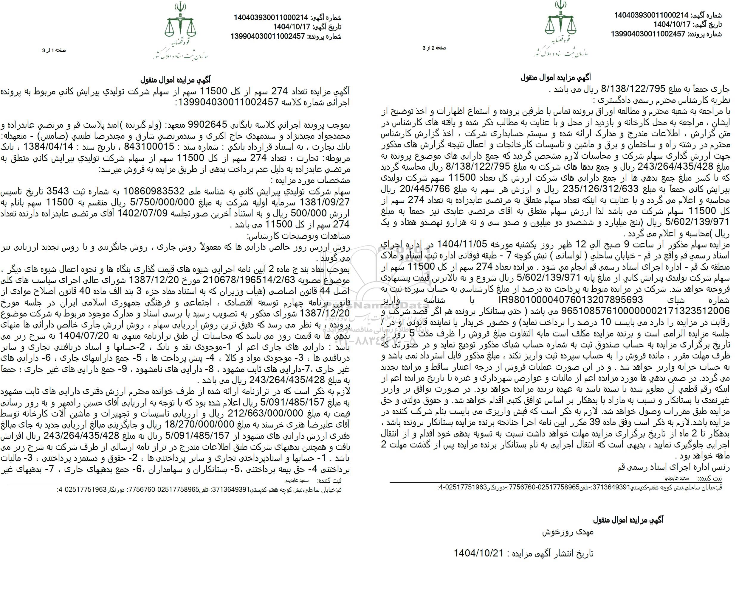 مزایده فروش تعداد 274 سهم از کل 11500 سهم از سهام شرکت تولیدی پیرایش کانی به مبلغ 5.602.139.971 ریال