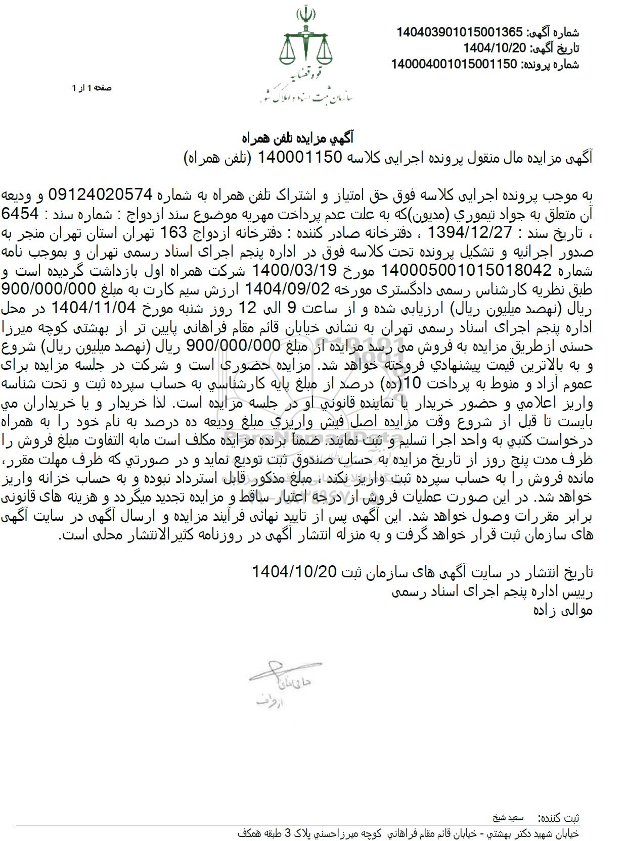 به موجب پرونده اجرایی کلاسه فوق حق امتیاز و اشتراک تلفن همراه به شماره 09124020574 و وديعه أن متعلق به جواد تیموري مديون که به علت عدم پرداخت مهریه موضوع سند ازدواج : شماره سند : 6454 ، تاریخ سند : 1394/12/27 ، دفتر خانه صادر کننده : دفتر خانه ازدواج 163 تهران استان تهران منجر به صدور اجرائیه و تشکیل پرونده تحت کلاسه فوق در اداره پنجم اجرای اسناد رسمی تهران و بموجب نامه شماره 140005001015018042 مورخ 1400.03.19 شرکت همراه اول بازداشت گردیده است و طبق نظریه کارشناس رسمی دادگستری مورخه 1404.09.02 ارزش سیم کارت به مبلغ 900.000.000 ريال نهصد میلیون ریال) ارزیابی شده و از ساعت 9 الى 12 روز شنبه مورخ 1404.11.04 در محل اداره پنجم اجرای اسناد رسمی تهران به نشانی خیابان قائم مقام فراهانی پایین تر از بهشتی کوچه میرزا حسنی از طریق مزایده به فروش می رسد مزایده از مبلغ 900/000/000 ريال نهصد میلیون ریال شروع و به بالاترین قیمت پیشنهادي فروخته خواهد شد. مزایده حضوری است و شرکت در جلسه مزایده برای عموم آزاد و منوط به پرداخت 10 (ده) درصد از مبلغ پایه کارشناسی به حساب سپرده ثبت و تحت شناسه واريز اعلامي و حضور خریدار یا نماینده قانوني او در جلسه مزایده است. لذا خریدار و یا خریداران مي بایست تا قبل از شروع وقت مزایده اصل فيش واريزي مبلغ وديعه ده در صد به نام خود را به همراه درخواست کتبي به واحد اجرا تسلیم و ثبت نمایند. ضمنا برنده مزایده مکلف است ما به التفاوت مبلغ فروش را ظرف مدت پنج روز از تاریخ مزایده به حساب صندوق ثبت تودیع نماید و در صورتی که ظرف مهلت مقرر مانده فروش را به حساب سپرده ثبت واریز نکند ، مبلغ مذکور قابل استرداد نبوده و به حساب خزانه واریز خواهد شد. در این صورت عملیات فروش از درجه اعتبار ساقط و مزایده تجدید میگردد و هزینه های قانونی برابر مقررات وصول خواهد شد. این آگهی پس از تایید نهائی فرآیند مزایده و ارسال آگهی در سایت آگهی های سازمان ثبت قرار خواهد گرفت و به منزله انتشار آگهی در روزنامه كثير الانتشار محلی است.