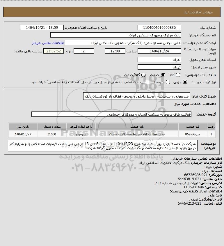 شرح کلی نیاز: ضدعفونی و سمپاشی محیط داخلی و محوطه فضای باز کودکستان بانک