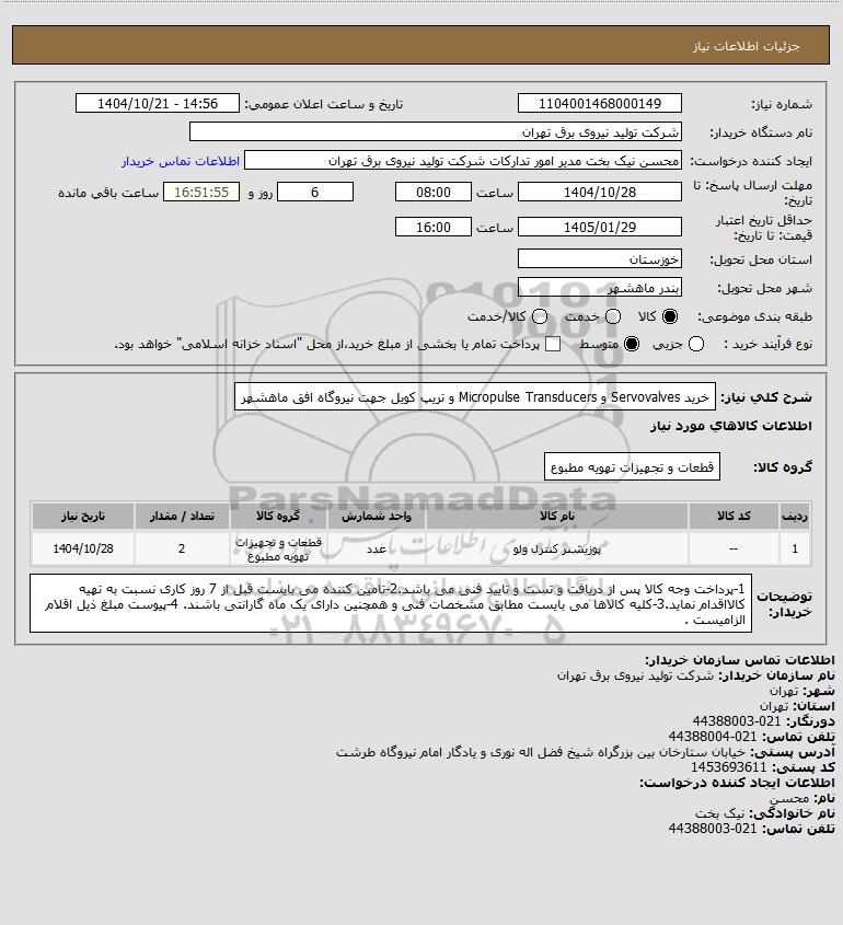شرح کلی نیاز: خرید Servovalves و Micropulse Transducers و تریپ کویل جهت نیروگاه افق ماهشهر