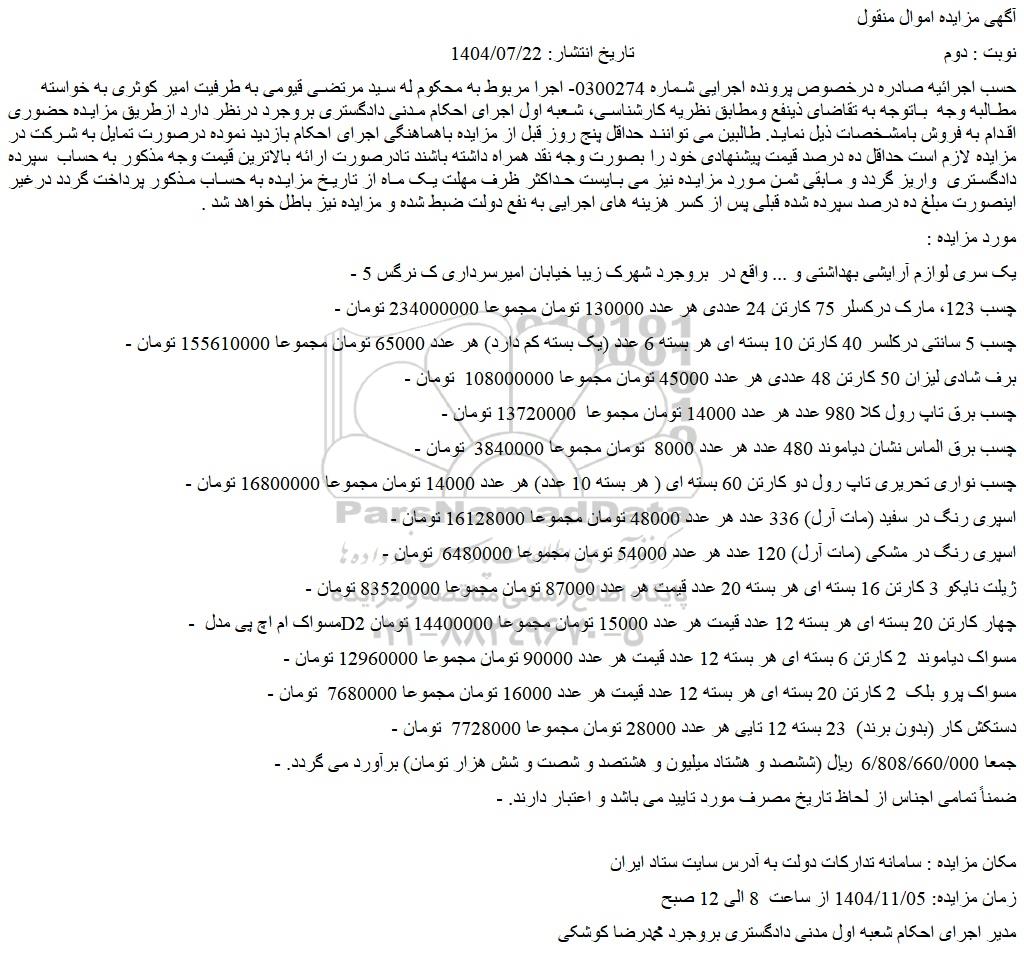 حسب اجرائیه صادره درخصوص پرونده اجرایی شماره 0300274- اجرا مربوط به محکوم له سید مرتضی قیومی به طرفیت امیر کوثری به خواسته مطالبه وجه  باتوجه به تقاضای ذینفع ومطابق نظریه کارشناسی، شعبه اول اجرای احکام مدنی دادگستری بروجرد درنظر دارد ازطریق مزایده حضوری اقدام به فروش بامشخصات ذیل نماید. طالبین می توانند حداقل پنج روز قبل از مزایده باهماهنگی اجرای احکام بازدید نموده درصورت تمایل به شرکت در مزایده لازم است حداقل ده درصد قیمت پیشنهادی خود را بصورت وجه نقد همراه داشته باشند تادرصورت ارائه بالاترین قیمت وجه مذکور به حساب  سپرده دادگستری  واریز گردد و مابقی ثمن مورد مزایده نیز می بایست حداکثر ظرف مهلت یک ماه از تاریخ مزایده به حساب مذکور پرداخت گردد درغیر اینصورت مبلغ ده درصد سپرده شده قبلی پس از کسر هزینه های اجرایی به نفع دولت ضبط شده و مزایده نیز باطل خواهد شد .