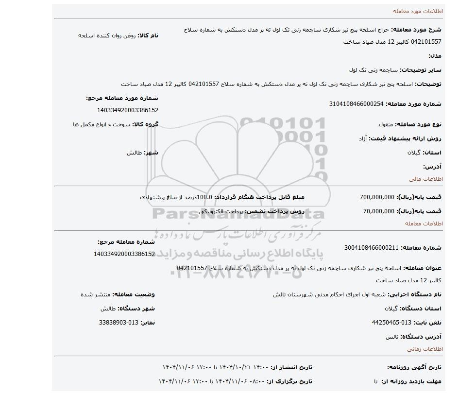 | شماره مورد معامله: 3104108466000254 | شماره مورد معامله مرجع: 140334920003386152 | |
