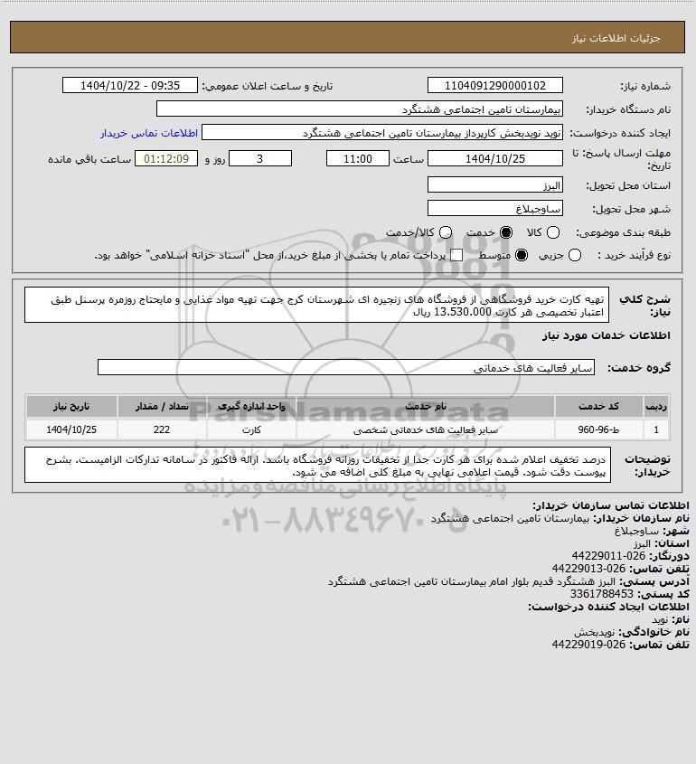 شرح کلی نیاز: تهیه کارت خرید فروشگاهی از فروشگاه های زنجیره ای شهرستان کرج جهت تهیه مواد غذایی و مایحتاج روزمره پرسنل طبق اعتبار تخصیصی هر کارت 13.530.000 ریال