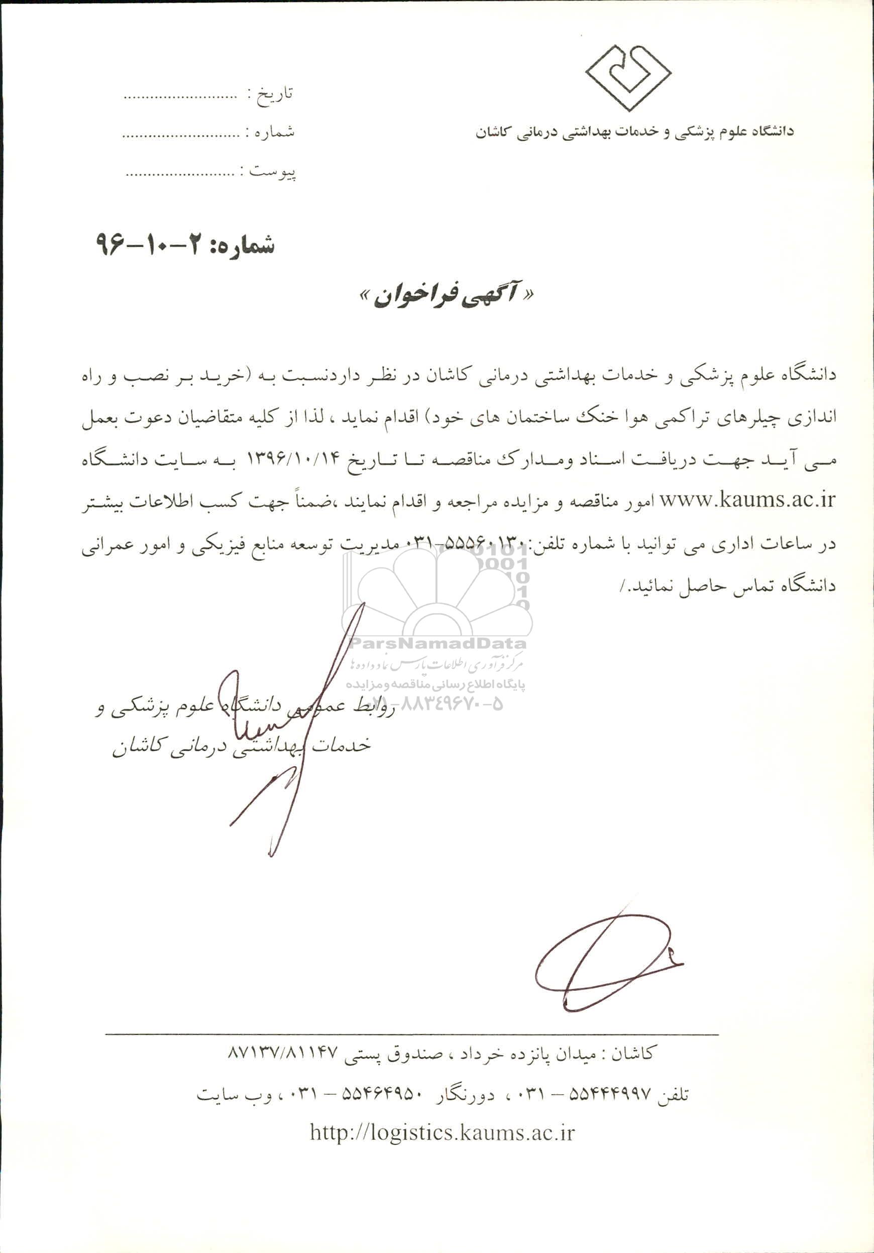 دانشگاه علوم پزشکی و خدمات بهداشتی درمانی کاشان در نظر دارد نسبت به خرید بر نصب و راه اندازی چیلرهای تراکمی هوا خنک ساختمان های خود اقدام نماید لذا از کلیه متقاضیان دعوت به عمل می آید جهت دریافت اسناد و مدارک مناقصه تا تاریخ 96.10.14 به سایت دانشگاه www.kaums.ac.ir امور مناقصه و مزایده مراجعه و اقدام نمایند ضمنا جهت کسب اطلاعات بیشتر در ساعات اداری می توانید با شماره تلفن 55560130- 031 مدیریت توسعه منابع فیزیکی و امور عمرانی دانشگاه تماس حاصل نمایید.