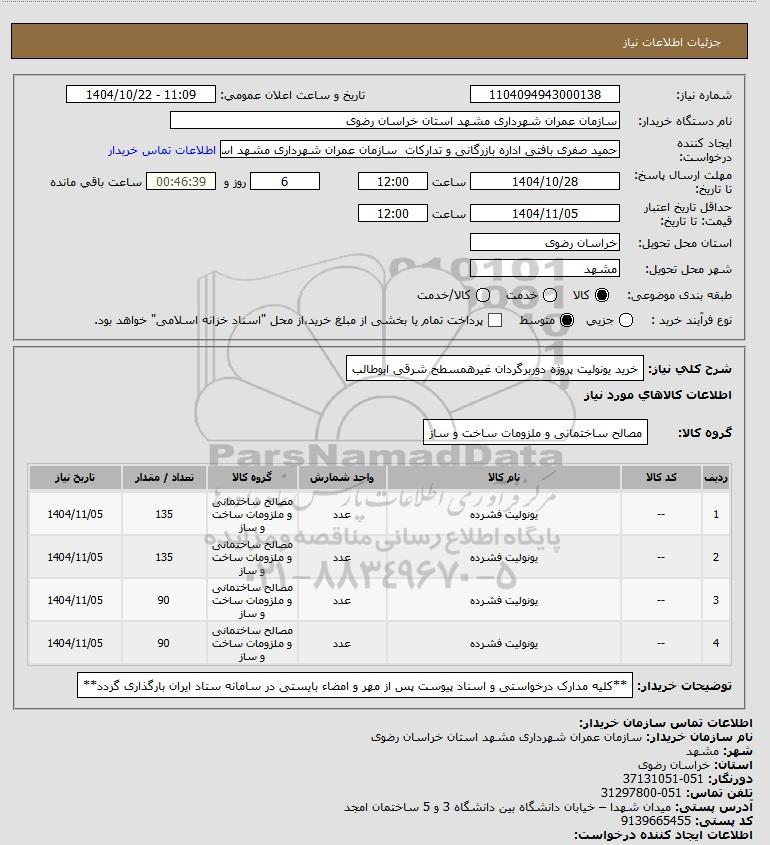 شرح کلی نیاز: خرید یونولیت پروژه دوربرگردان غیرهمسطح شرقی ابوطالب