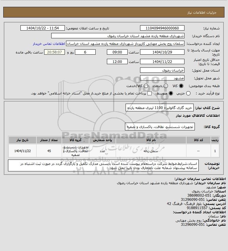 شرح کلی نیاز: خرید گاری گالوانیزه 1100 لیتری منطقه یازده
