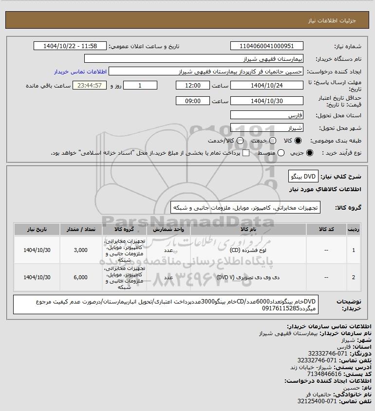 توضیحات خریدار:DVDخام بینگوتعداد6000عدد/CDخام بینگو3000عددپرداخت اعتباری/تحویل انباربیمارستان/درصورت عدم کیفیت مرجوع میگردد09176115285