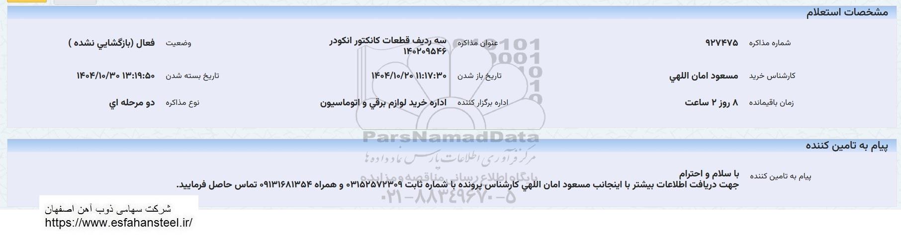 استعلام بها و موضوع استعلام استعلام سه ردیف قطعات کانکتور انکودر به اطلاع کلیه شرکت‌ها و افراد متخصص واجد شرایط می‌رساند، آگهی گذار در نظر دارد از طریق استعلام بها، نسبت به انتخاب و دریافت پیشنهادات اقدام نماید. این استعلام با کد آگهی ثبت شده در سامانه خبرگزاری پارس نماد : 10130945 منتشر شده است. مشخصات استعلام : تاریخ شروع استعلام: 1404/10/22 آخرین مهلت ارسال پیشنهاد قیمت : 1404/10/30 و محل اجرای پروژه : استان مناقصات استان اصفهان میباشد. استعلام قیمت مورد درخواست : استعلام سه ردیف قطعات کانکتور انکودر با دسته‌بندی‌های تخصصی و گروه های مرتبط : ابزار و یراق آلات, ساخت،نصب و تعمیرات صنایع فولاد, تجهیزات و ماشین آلات صنعتی, استعلام اطلاع رسانی میگردد.