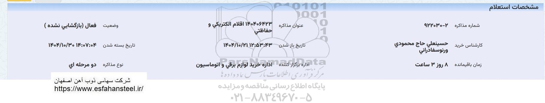 عنوان مذاکره: 140406423 اقلام الکتریکی و حفاظتی