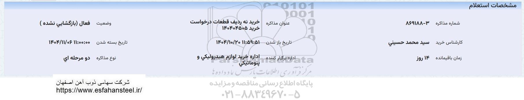 عنوان مذاکره : خرید نه ردیف قطعات درخواست خرید 140404505