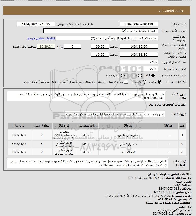 شرح کلی نیاز: خرید 3 ردیف از لوازم مورد نیاز خوابگاه ایستگاه راه اهن رشت مطابق فایل پیوستی