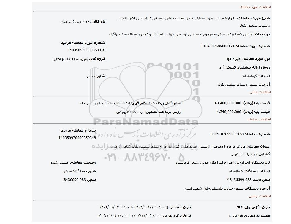| شرح مورد معامله: حراج اراضی کشاورزی متعلق به مرحوم احمدعلی اوسطی فرزند علی اکبر واقع در روستای سفید زنگول | نام کالا: قطعه زمین کشاورزی | |