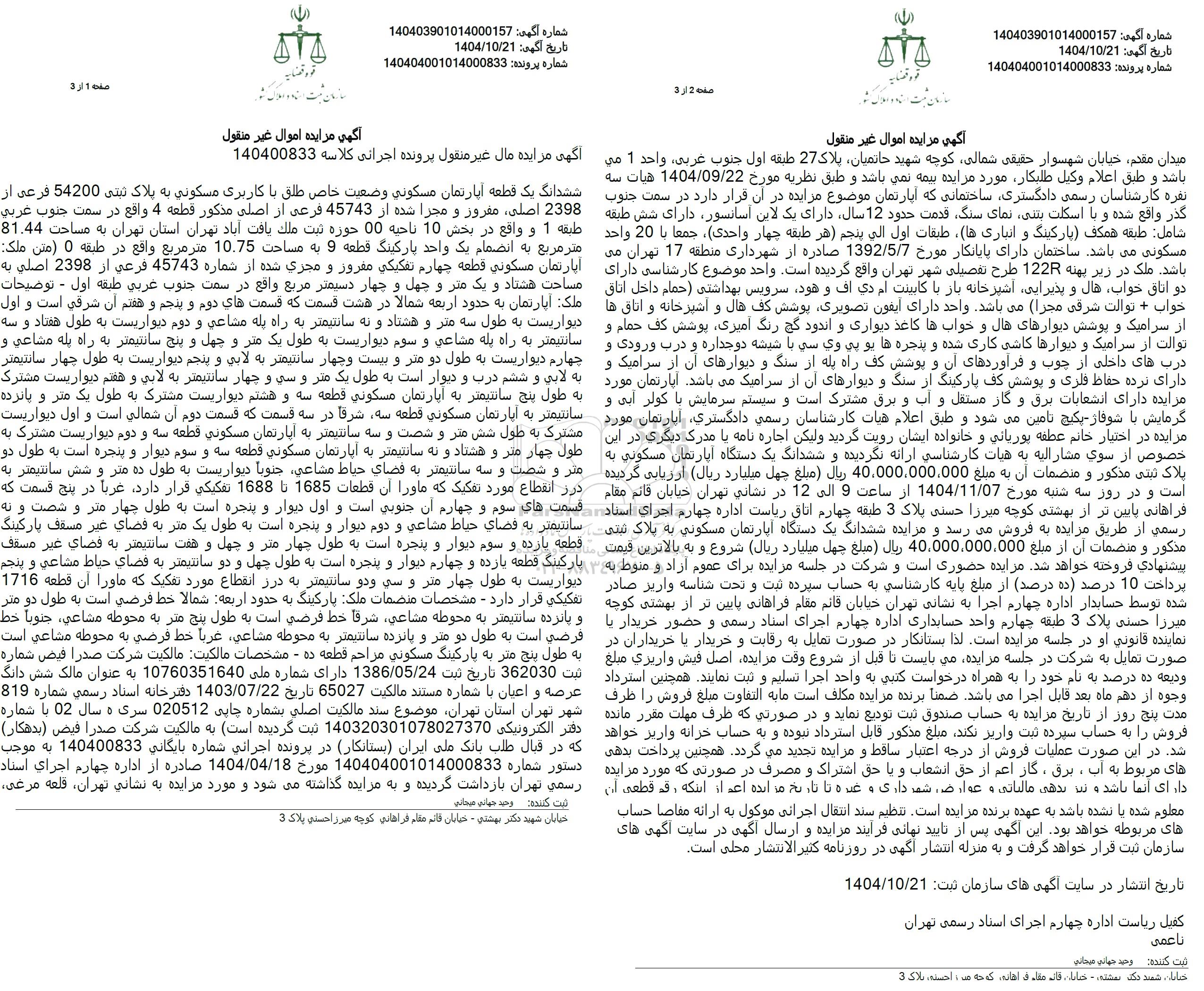 مزایده ششدانگ یک قطعه آپارتمان مسکونی به پلاک ثبتی 54200 فرعی از 2398 اصلی , مزایده ششدانگ یک قطعه آپارتمان مسکونی به پلاک ثبتی 54200 فرعی از 2398 اصلی