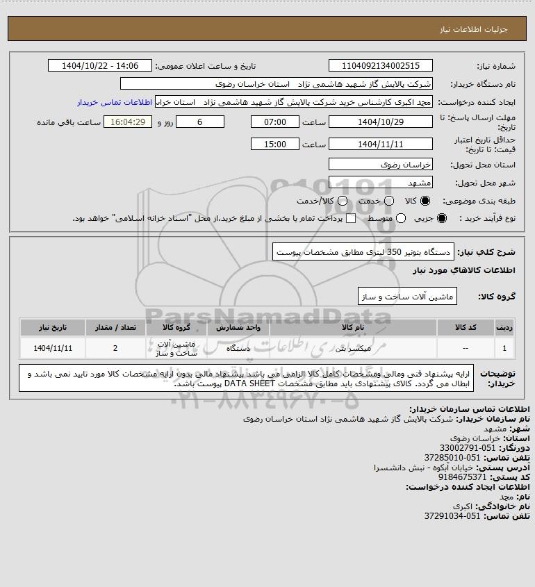 شرح کلی نیاز: دستگاه بتونیر 350 لیتری مطابق مشخصات پیوست