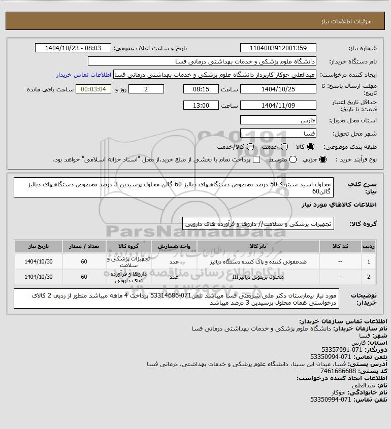 | 1 | -- | ضدعفونی کننده و پاک کننده دستگاه دیالیز | عدد | تجهیزات پزشکی و سلامت | 60 | 1404/10/30 |