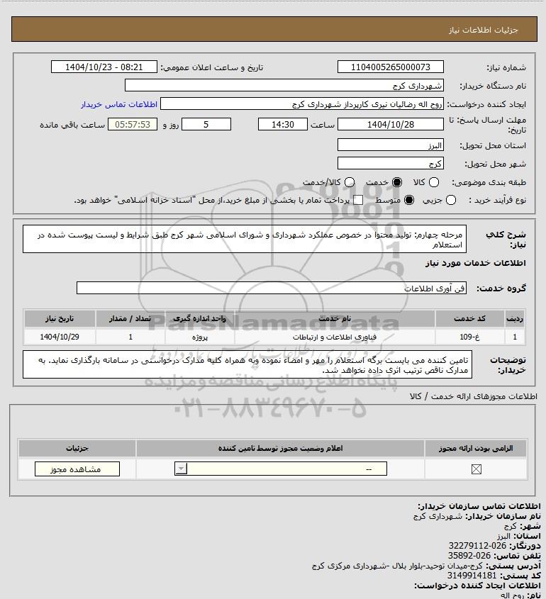 استعلام بها و موضوع استعلام استعلام مرحله چهارم: تولید محتوا در خصوص عملکرد شهرداری و شورای اسلامی شهر کرج طبق شرایط و لیست پیوست شده در استعلام به اطلاع کلیه شرکتها و افراد متخصص واجد شرایط میرساند، آگهی گذار در نظر دارد از طریق استعلام بها، نسبت به انتخاب و دریافت پیشنهادات اقدام نماید. این استعلام با کد آگهی ثبت شده در سامانه خبرگزاری پارس نماد : 10132966 منتشر شده است. مشخصات استعلام : تاریخ شروع استعلام: 1404/10/23 آخرین مهلت ارسال پیشنهاد قیمت : 1404/10/28 و محل اجرای پروژه : استان مناقصات استان البرز میباشد. استعلام قیمت مورد درخواست : استعلام مرحله چهارم: تولید محتوا در خصوص عملکرد شهرداری و شورای اسلامی شهر کرج طبق شرایط و لیست پیوست شده در استعلام با دستهبندیهای تخصصی و گروه های مرتبط : طراحی چاپ و تبلیغات, تیزرهای تبلیغاتی و تلویزیون, استعلام اطلاع رسانی میگردد.