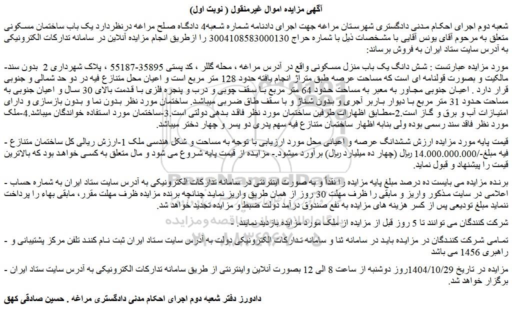 شعبه دوم اجرای احکام مدنی دادگستری شهرستان مراغه جهت اجرای دادنامه شماره شعبه4 دادگاه صلح مراغه درنظردارد یک باب ساختمان مسکونی متعلق به مرحوم آقای یونس آقایی با مشخصات ذیل با شماره حراج 3004108583000130 را ازطریق انجام مزایده آنلاین در سامانه تدارکات الکترونیکی به آدرس سایت ستاد ایران به فروش برساند: