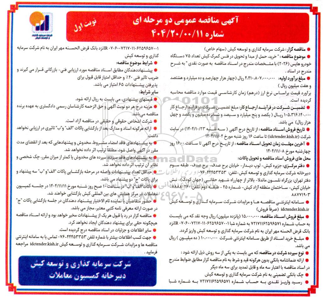 موضوع مناقصه : خرید، حمل از مبدا و تحویل در فنس گمرک کیش تعداد 75 دستگاه خودرو هایس (2026) با مشخصات مندرج در اسناد مناقصه به صورت نقدی به شرح مندرج در اسناد .