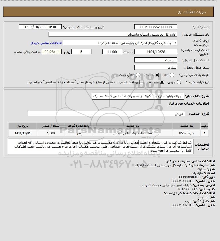 شرح کلی نیاز: اجرای پایلوت طرح پیشگیری از آسیبهای اجتماعی فضای مجازی