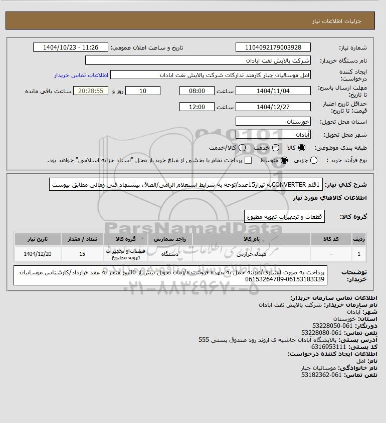 شرح کلی نیاز: 1قلم CONVERTERبه تیراژ15عدد/توجه به شرایط استعلام الزامی/الصاق پیشنهاد فنی ومالی مطابق پیوست