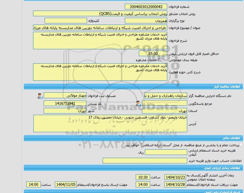 | نام دستگاه اجرایی مناقصه گزار | سازمان راهداری و حمل و نقل جاده ای | مسئول ثبت مناقصه | |