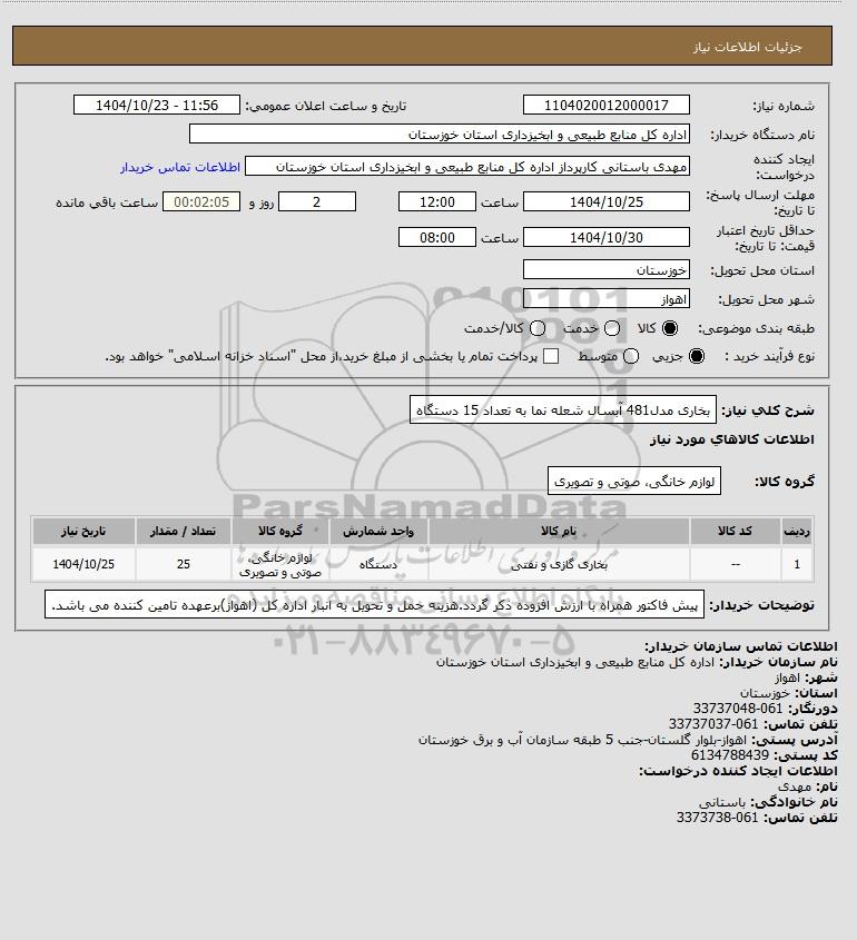شرح کلی نیاز: بخاری مدل481 آبسال شعله نما به تعداد 15 دستگاه