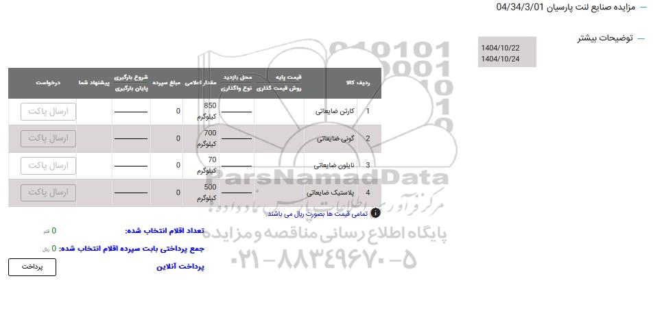 مزایده عمومی مزایده انواع کارتن ضایعاتی و برگزار میگردد. از کلیه افراد متخصص و شرکت‌های واجد شرایط دعوت به عمل می‌آید تا در این مزایده با کد خبرگزاری پارس نماد : 10136310 شرکت نمایند تاریخ شروع مزایده : 1404/10/23 مهلت شرکت در مزایده: تا پایان روز 1404/10/24 مکان برگزاری اموال واگذاری استان‌های مزایدات استان سایر و دسته‌بندی‌های مربوط به این حراجی کارتن, پلاستیک ، پلی اتیلن و مستر بچ میباشد.