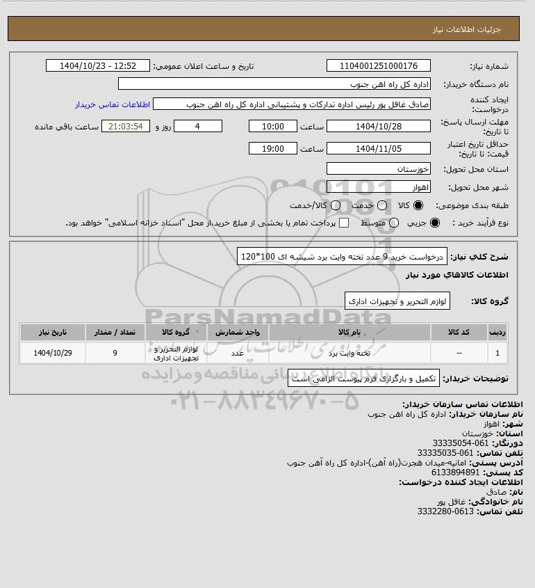 شرح کلی نیاز: درخواست خرید 9 عدد تخته وایت برد شیشه ای 100*120