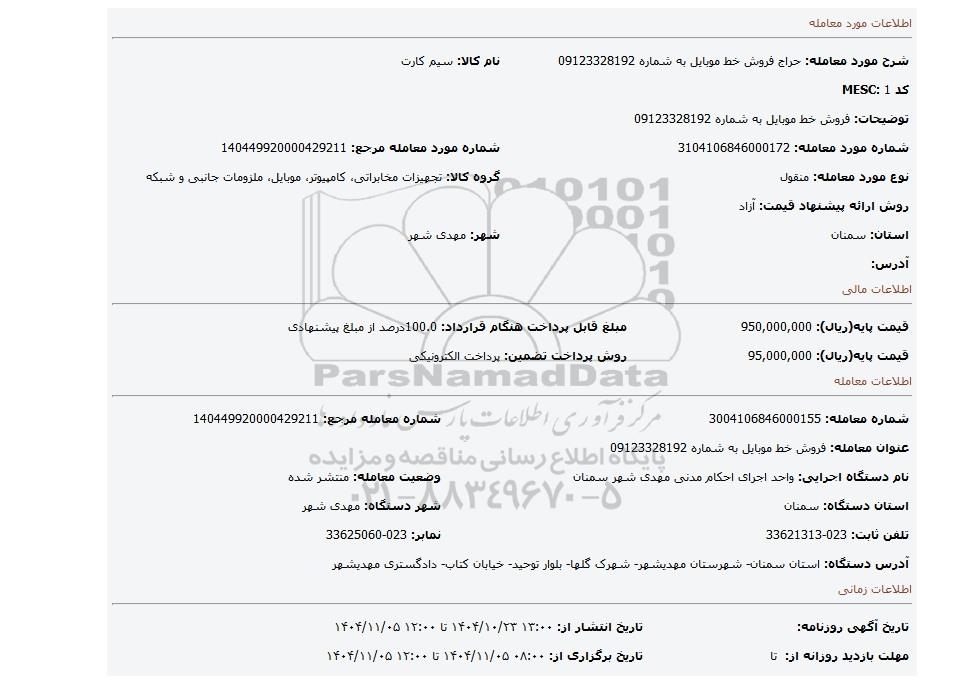 | شرح مورد معامله: حراج فروش خط موبایل به شماره 09123328192 | نام کالا: سیم کارت | |