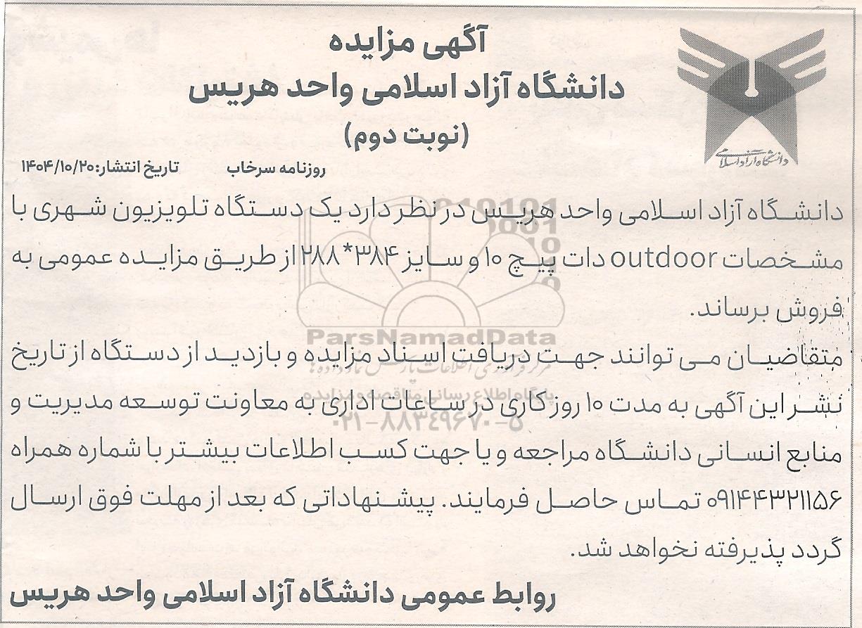 دانشگاه آزاد اسلامی واحد هریس در نظر دارد یک دستگاه تلویزیون شهری با مشخصات outdoor دات پیچ 10 و سایز 384*288 از طریق مزایده عمومی به