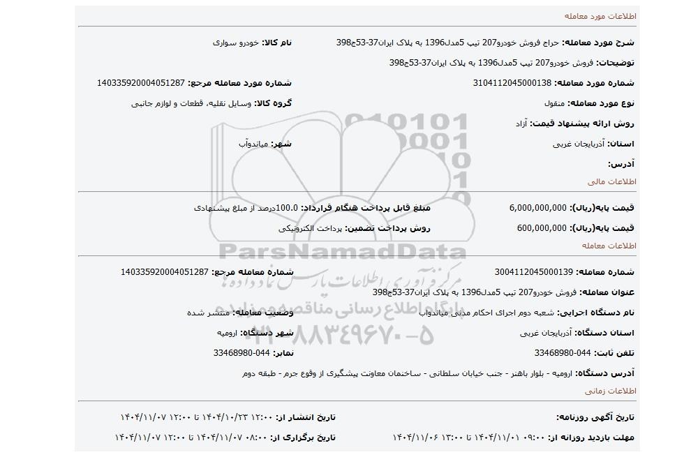 | شماره مورد معامله: 3104112045000138 | شماره مورد معامله مرجع: 140335920004051287 | |