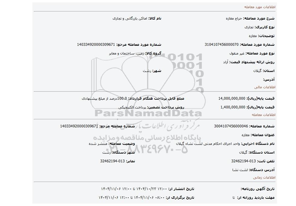 | شماره مورد معامله: 3104107456000070 | شماره مورد معامله مرجع: 140334920000309671 | |