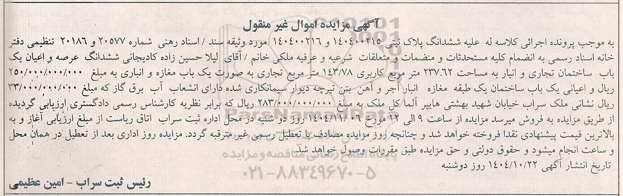 به موجب پرونده اجرائی كلاسه له علیه ششدانگ پلاک ثبتی 140400215 و 140400216 مورد وثیقه سند اسناد رهنی شماره 20577 و 20186 تنظیمی دفترخانه اسناد رسمی به انضمام کلیه مستحدثات و منضمات و متعلقات شرعیه و عرفیه ملكی خانم . آقای لیلا حسین زاده کادیجانی ششدانگ عرصه و اعیان یکباب ساختمان تجاری و انبار به مساحت 237.62 متر مربع کاربری 143.78 متر مربع تجاری به صورت یک باب مغازه و انباری به مبلغ 250.000.000.000 ریال و اعیانی یک باب ساختمان یک طبقه مغازه انبار اجر و آهن بتن تیرچه دیوار سیمانکاری شده دارای انشعاب آب برق گاز که مبلغ 33.000.000.000 ریال نشانی ملک سراب خیابان شهید بهشتی هایپر الما كل ملک بخ مبلغ 283.000.000.000 ریال که برابر نظریه کارشناس رسمی دادگستری ارزیابی گردیده از طریق مزایده به فروش میرسد. مزایده از ساعت 9 الی 12 مورخ 1404.11.6 روز دوشنبه در محل اداره ثبت سراب اتاق ریاست از مبلغ ارزیابی آغاز و به بالاترین قیمت پیشنهادی نقدا فروخته خواهد شد و چنانچه روز مزایده مصادف با تعطیل رسمی غیر مترقبه گردد مزایده روز اداری بعد از تعطیل در همان محل و ساعت انجام میشود و حقوق دولتی و حق مزایده طبق مقررات وصول خواهد شد.