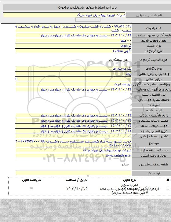 مناقصه خرید کنتور سه فاز هوشمند مستقیم ستاد راهبری- ۲۰۰۴۰۹۲۷۳۴۰۰۰۱۹۸ -۱۴۰۴۱۰۰۱۱۹۰۷ از کلیه افراد متخصص و شرکت‌ها واجد شرایط دعوت به عمل می‌آید در مناقصه با کد خبرگزاری پارس نماد: 10137425 شرکت نمایند. این مناقصه در تاریخ 1404/10/23 شروع و مهلت آن تا تاریخ 1404/10/24 میباشد.