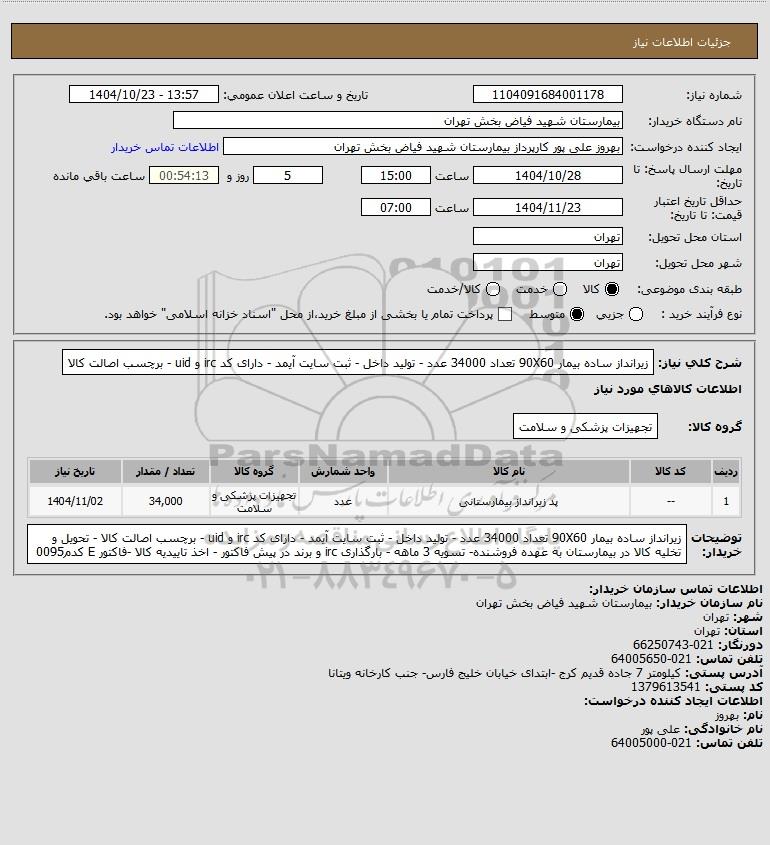 شرح کلی نیاز: زیرانداز ساده بیمار 90X60 تعداد 34000 عدد - تولید داخل - ثبت سایت آیمد - دارای کد irc و uid - برچسب اصالت کالا