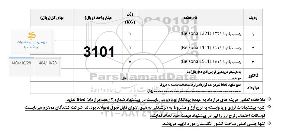 استعلام بها و موضوع استعلام استعلام چسب بلزونا به اطلاع کلیه شرکتها و افراد متخصص واجد شرایط میرساند، آگهی گذار در نظر دارد از طریق استعلام بها، نسبت به انتخاب و دریافت پیشنهادات اقدام نماید. این استعلام با کد آگهی ثبت شده در سامانه خبرگزاری پارس نماد : 10137436 منتشر شده است. مشخصات استعلام : تاریخ شروع استعلام: 1404/10/23 آخرین مهلت ارسال پیشنهاد قیمت : 1404/10/28 و محل اجرای پروژه : استان مناقصات استان سایر میباشد. استعلام قیمت مورد درخواست : استعلام چسب بلزونا با دستهبندیهای تخصصی و گروه های مرتبط : صنایع رنگ،رزین و چسب, استعلام اطلاع رسانی میگردد.