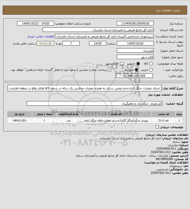 شرح کلی نیاز: اجرای عملیات جنگلکاری-احیاء وغنی سازی به همراه عملیات مراقبتی یک ساله در سطح 6/4 هکتار واقع در منطقه افراتخت