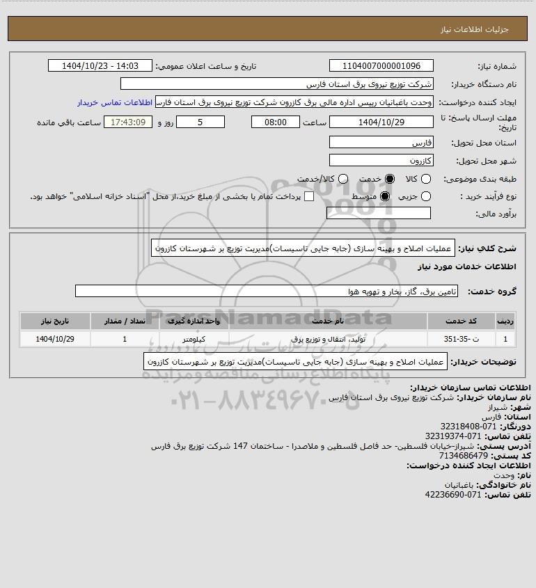 شرح کلی نیاز: عملیات اصلاح و بهینه سازی (جابه جایی تاسیسات)مدیریت توزیع بر شهرستان کازرون