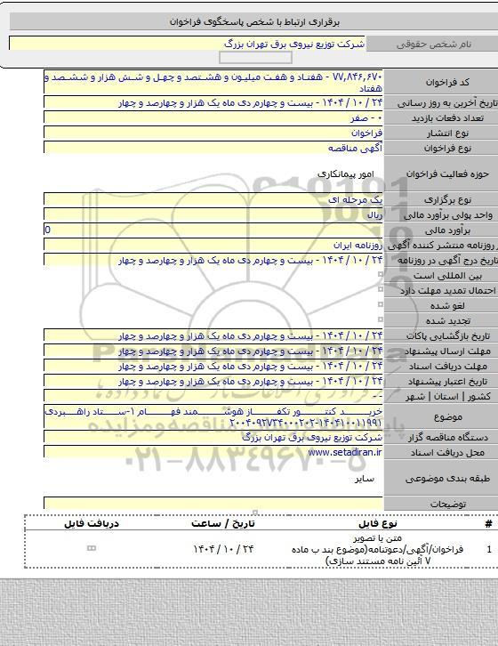 این مناقصه در تاریخ 1404/10/23 شروع و مهلت آن تا تاریخ 1404/10/24 میباشد.