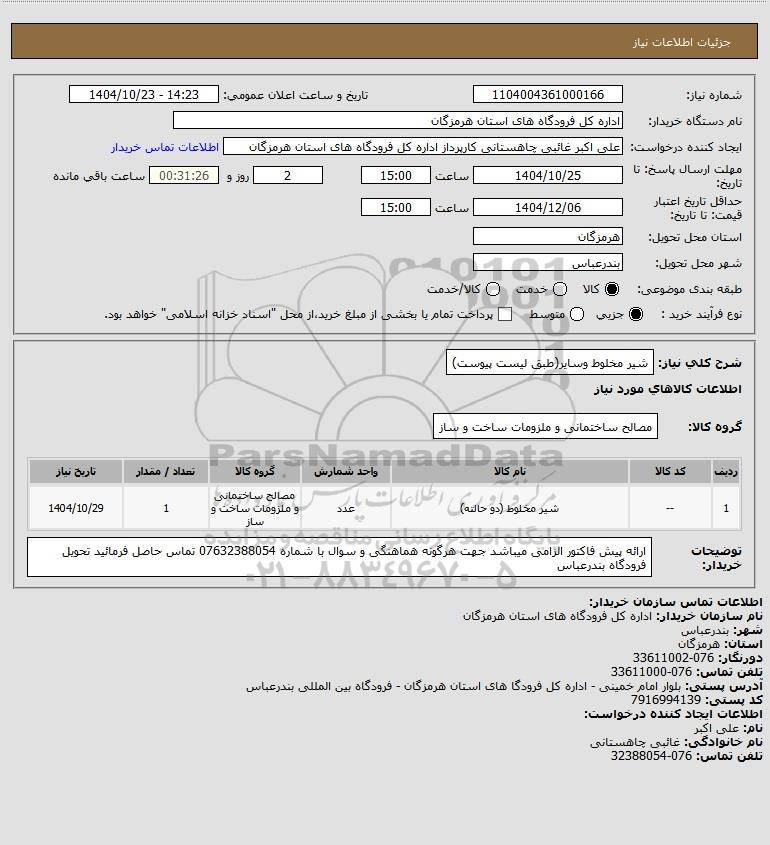 | 1 | -- | شیر مخلوط (دو حالته) | عدد | مصالح ساختمانی و ملزومات ساخت و ساز | 1 | 1404/10/29 |