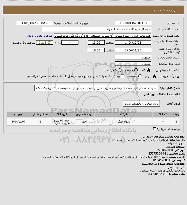 شرح کلی نیاز: تجدید استعلام خرید کارت خام مایفر و ملزومات پرینتر کارت – مطابق لیست پیوست - تسویه یک ماهه