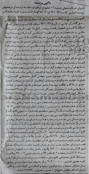 مزایده عمومی مزایده فروش ششدانگ ملک برگزار میگردد. از کلیه افراد متخصص و شرکتهای واجد شرایط دعوت به عمل میآید تا در این مزایده با کد خبرگزاری پارس نماد : 1013795 شرکت نمایند تاریخ شروع مزایده : 1396/10/11 مهلت شرکت در مزایده: تا پایان روز 1396/10/27 مکان برگزاری اموال واگذاری استانهای اصفهان و دستهبندیهای مربوط به این حراجی املاک و زمین میباشد.