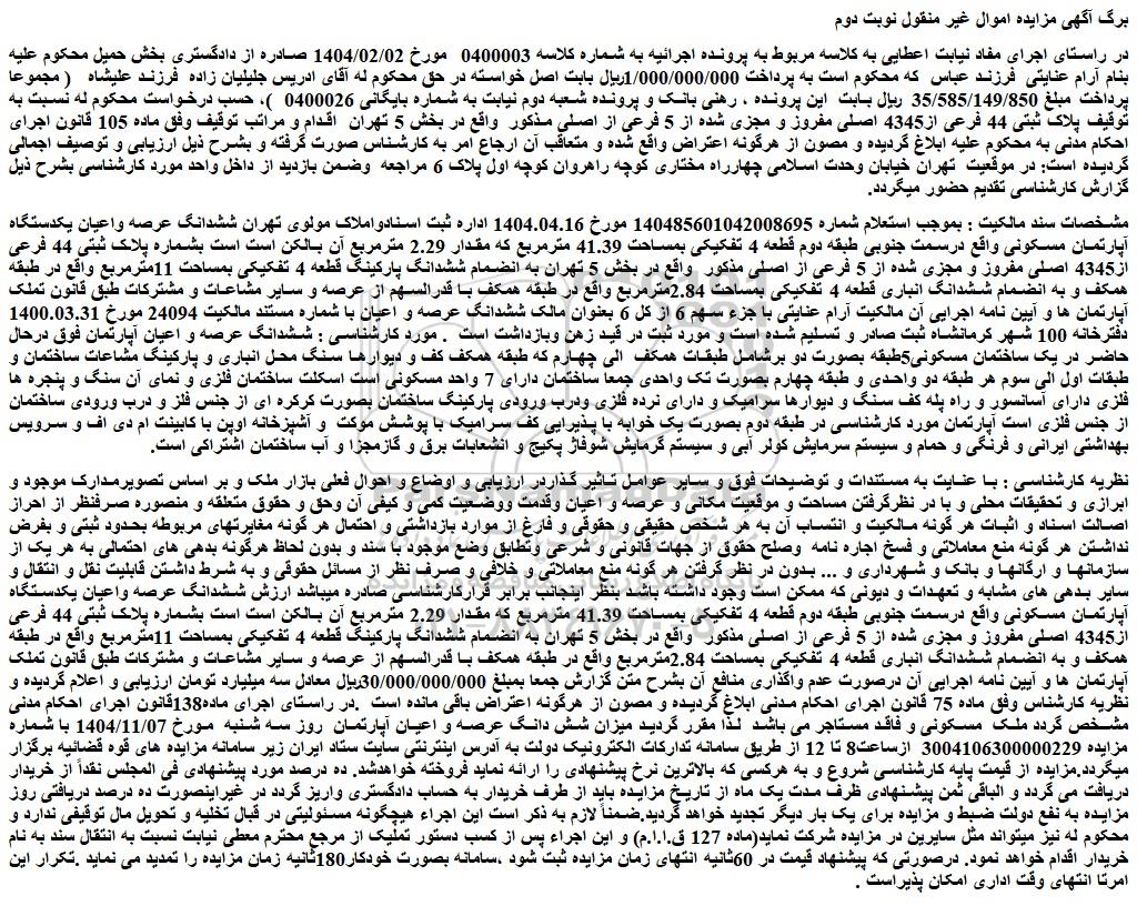 در راستای اجرای مفاد نیابت اعطایی به کلاسه مربوط به پرونده اجرائیه به شماره کلاسه 0400003 مورخ 1404/02/02 صادره از دادگستری بخش حمیل محکوم علیه بنام آرام عنایتی فرزند عباس که محکوم است به پرداخت 1/000/000/000ریال بابت اصل خواسته در حق محکوم له آقای ادریس جلیلیان زاده فرزند علیشاه ( مجموعا پرداخت مبلغ 35/585/149/850 ریال بابت این پرونده ، رهنی بانک و پرونده شعبه دوم نیابت به شماره بایگانی 0400026 )، حسب درخواست محکوم له نسبت به توقیف پلاک ثبتی 44 فرعی از4345 اصلی مفروز و مجزی شده از 5 فرعی از اصلی مذکور واقع در بخش 5 تهران اقدام و مراتب توقیف وفق ماده 105 قانون اجرای احکام مدنی به محکوم علیه ابلاغ گردیده و مصون از هرگونه اعتراض واقع شده و متعاقب آن ارجاع امر به کارشناس صورت گرفته و بشرح ذیل ارزیابی و توصیف اجمالی گردیده است: در موقعیت تهران خیابان وحدت اسلامی چهارراه مختاری کوچه راهروان کوچه اول پلاک 6 مراجعه وضمن بازدید از داخل واحد مورد کارشناسی بشرح ذیل گزارش کارشناسی تقدیم حضور میگردد.