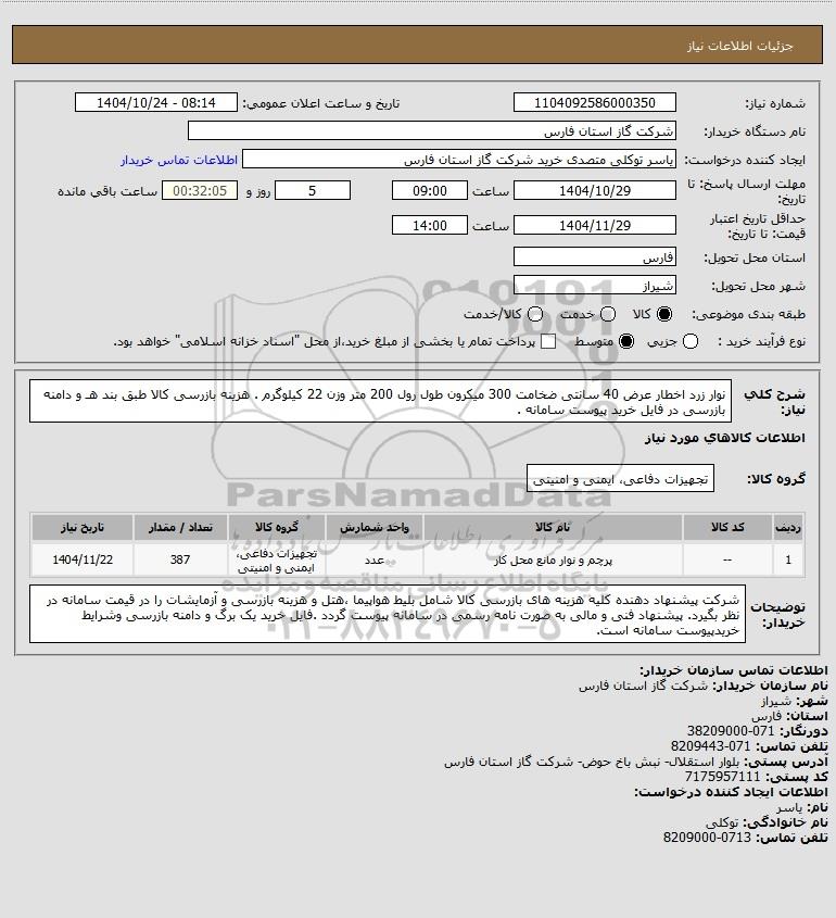 شرح کلی نیاز: نوار زرد اخطار عرض 40 سانتی ضخامت 300 میکرون طول رول 200 متر وزن 22 کیلوگرم . هزینه بازرسی کالا طبق بند هـ و دامنه بازرسی در فایل خرید پیوست سامانه .