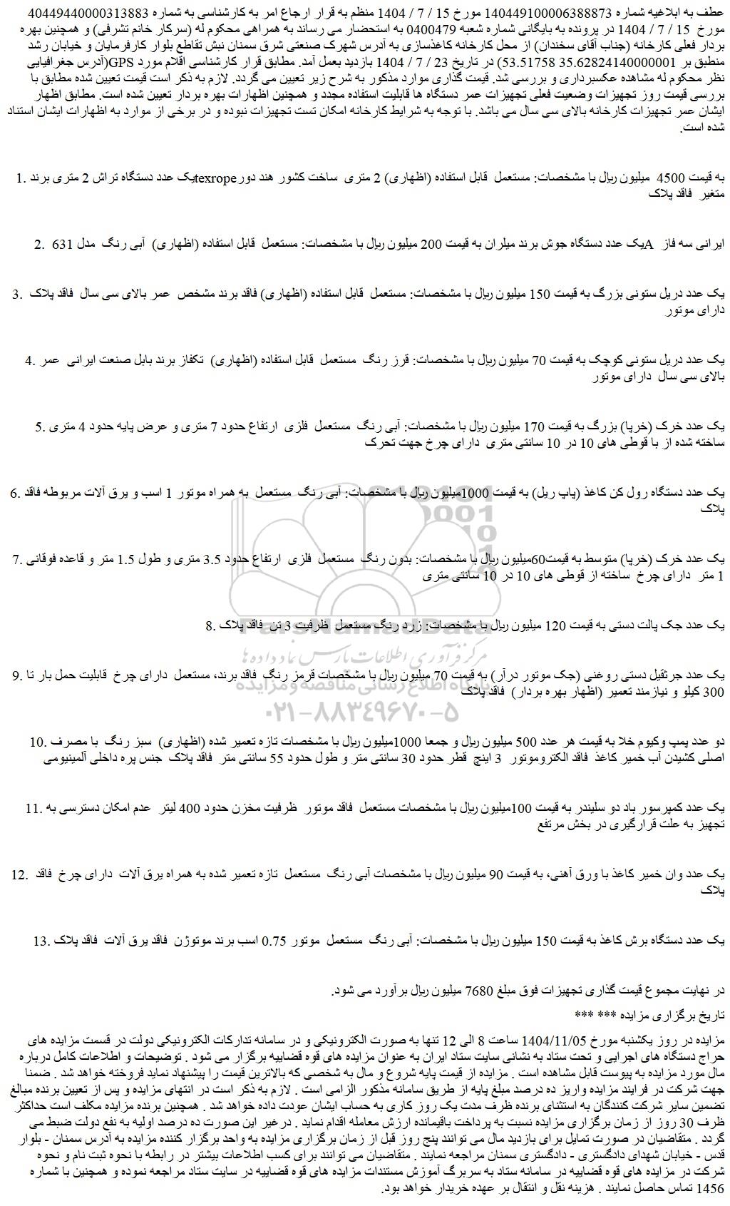 عطف به ابلاغیه شماره 140449100006388873 مورخ 15 / 7 / 1404 منظم به قرار ارجاع امر به کارشناسی به شماره 40449440000313883 مورخ  15 / 7 / 1404 در پرونده به بایگانی شماره شعبه 0400479 به استحضار می رساند به همراهی محکوم له (سرکار خانم تشرفی) و همچنین بهره بردار فعلی کارخانه (جناب آقای سخندان) از محل کارخانه کاغذسازی به آدرس شهرک صنعتی شرق سمنان نبش تقاطع بلوار کارفرمایان و خیابان رشد (آدرس جغرافیایی gps منطبق بر 35.62824140000001 53.51758) در تاریخ 23 / 7 / 1404 بازدید بعمل آمد. مطابق قرار کارشناسی اقلام مورد نظر محکوم له مشاهده عکسبرداری و بررسی شد. قیمت گذاری موارد مذکور به شرح زیر تعیین می گردد. لازم به ذکر است قیمت تعیین شده مطابق با بررسی قیمت روز تجهیزات وضعیت فعلی تجهیزات عمر دستگاه ها قابلیت استفاده مجدد و همچنین اظهارات بهره بردار تعیین شده است. مطابق اظهار ایشان عمر تجهیزات کارخانه بالای سی سال می باشد. با توجه به شرایط کارخانه امکان تست تجهیزات نبوده و در برخی از موارد به اظهارات ایشان استناد شده است.