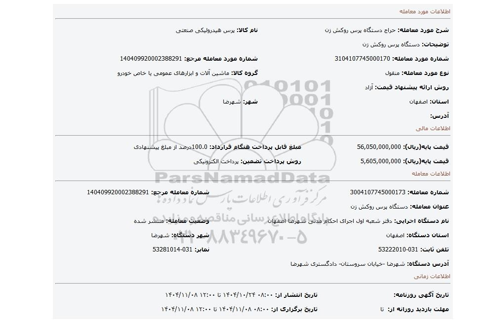 | شماره مورد معامله: 3104107745000170 | شماره مورد معامله مرجع: 140409920002388291 | |