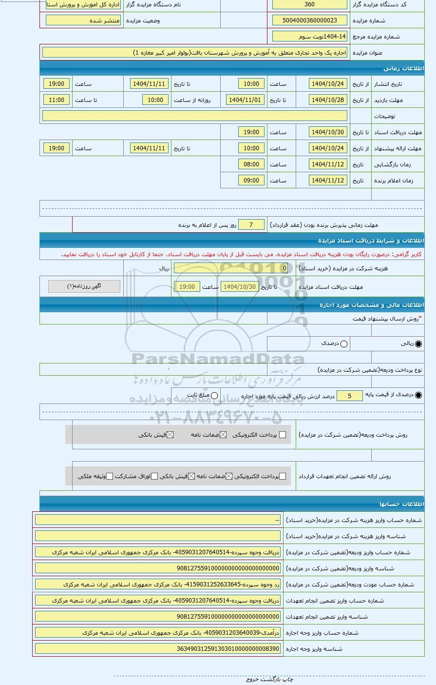 | شماره مورد اجاره | 5104000360000045 | نوع برگزاری مزایده | مزایده عمومی | |