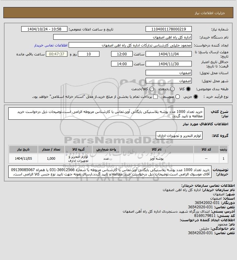 | 1 | -- | پوشه آویز | عدد | لوازم التحریر و تجهیزات اداری | 1,000 | 1404/11/05 |