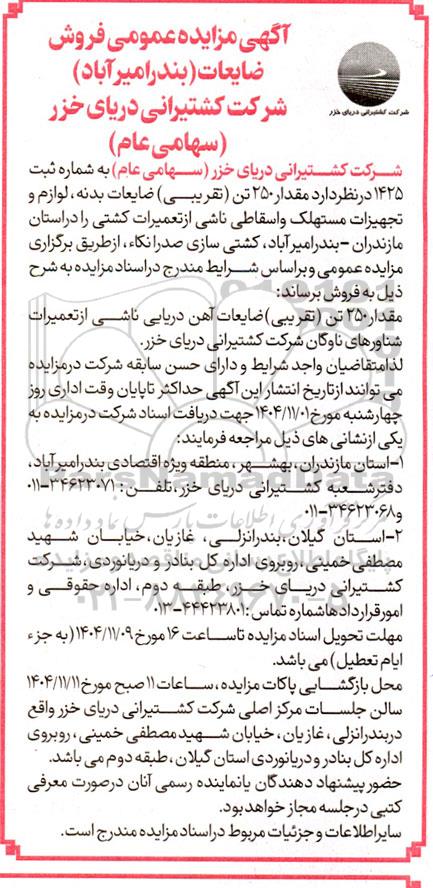 شرکت کشتیرانی دریای خزر (سهامی عام) به شماره ثبت 1425 در نظر دارد مقدار 250 تن (تقریبی) ضایعات بدنه ، لوازم و تجهیزات مستهلک و اسقاطی ناشی از تعمیرات کشتی را در استان مازندران - بندر امیر آباد کشتی سازی صدرا نکاء از طریق برگزاری مزایده عمومی و بر اساس شرایط مندرج در اسناد مزایده به شرح ذیل به فروش برساند